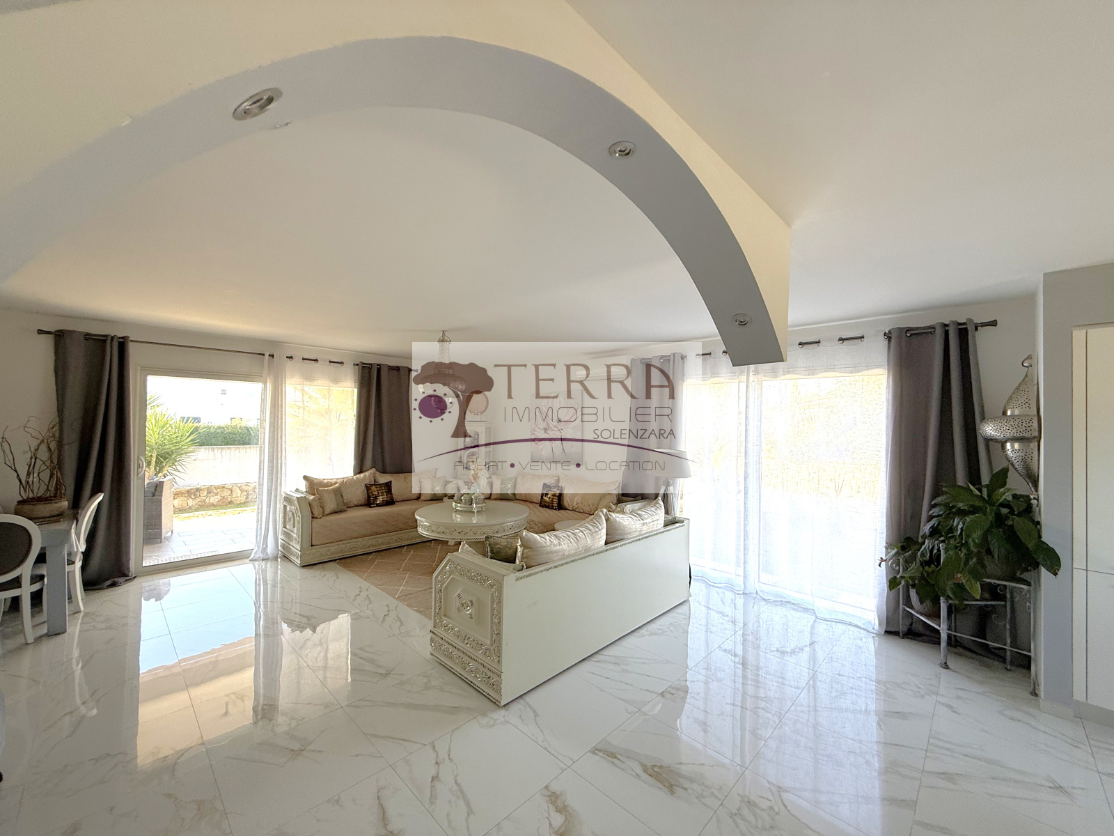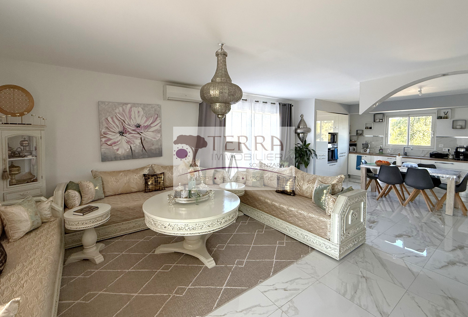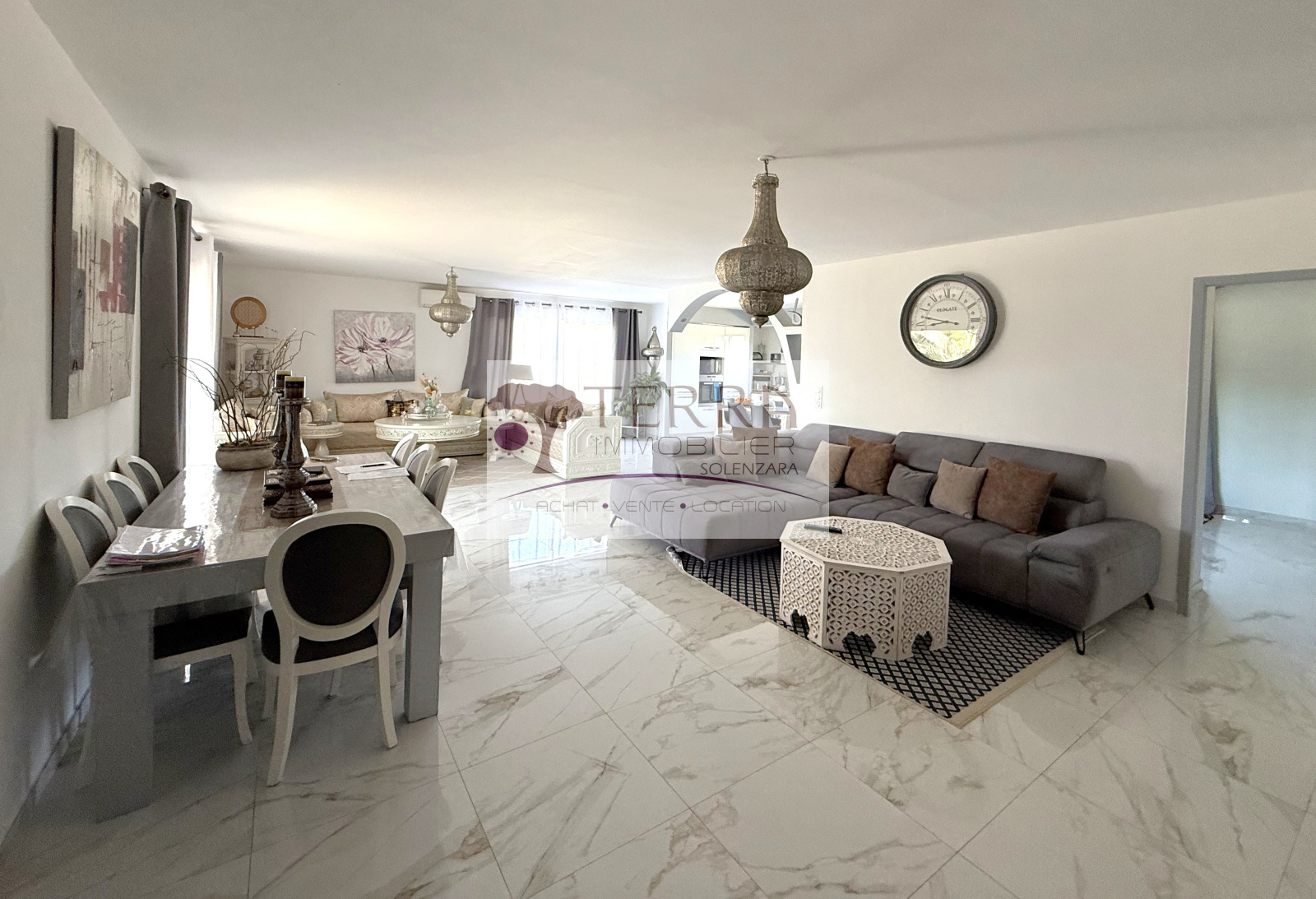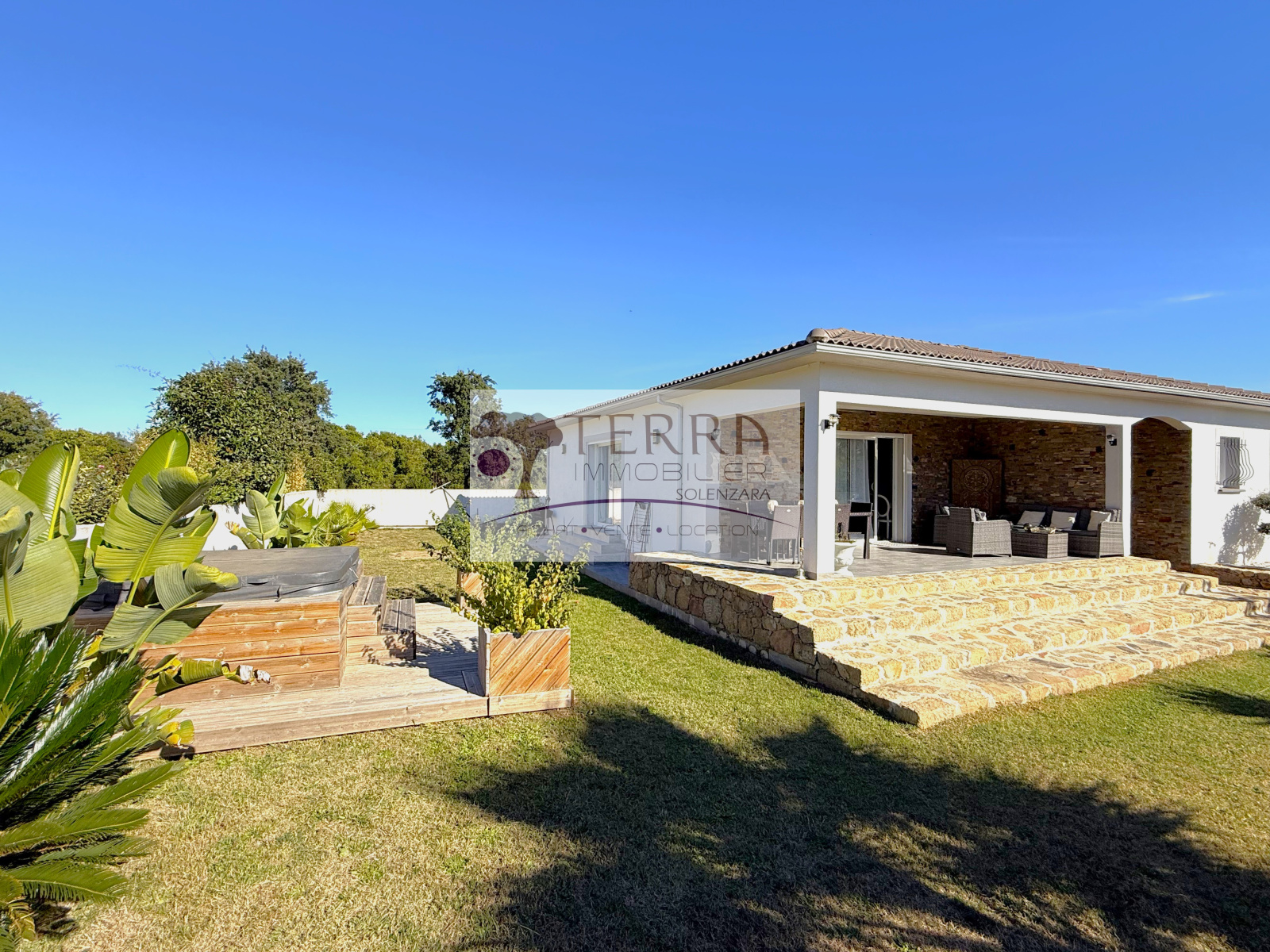 Terra immobilier Solenzara, vous propose à la vente en exclusivité, sur la commune de Ghisonaccia, à Ghisonaccia Gare, située dans un secteur calme, cette villa T5 de 162 m² de plain-pied offre un cadre de vie idéal. Ses murs en pierre apportent un charme intemporel, tandis que ses prestations modernes vous séduiront. Composée d'un séjour spacieux et lumineux avec cuisine ouverte entièrement équipée, sol en carrelage effet marbre, climatisation réversible. 4 chambres, dont une suite parentale avec salle d'eau/wc.Salle de bain élégante : baignoire balnéo et douche à l’italienne sous arche. Finitions soignées, volumes généreux et luminosité optimale. Terrasse couverte pour vos repas en extérieur. Terrain de 1.200 m² arboré et aménagé, agrémenté d'un jacuzzi. A cela s'ajoute un garage indépendant.